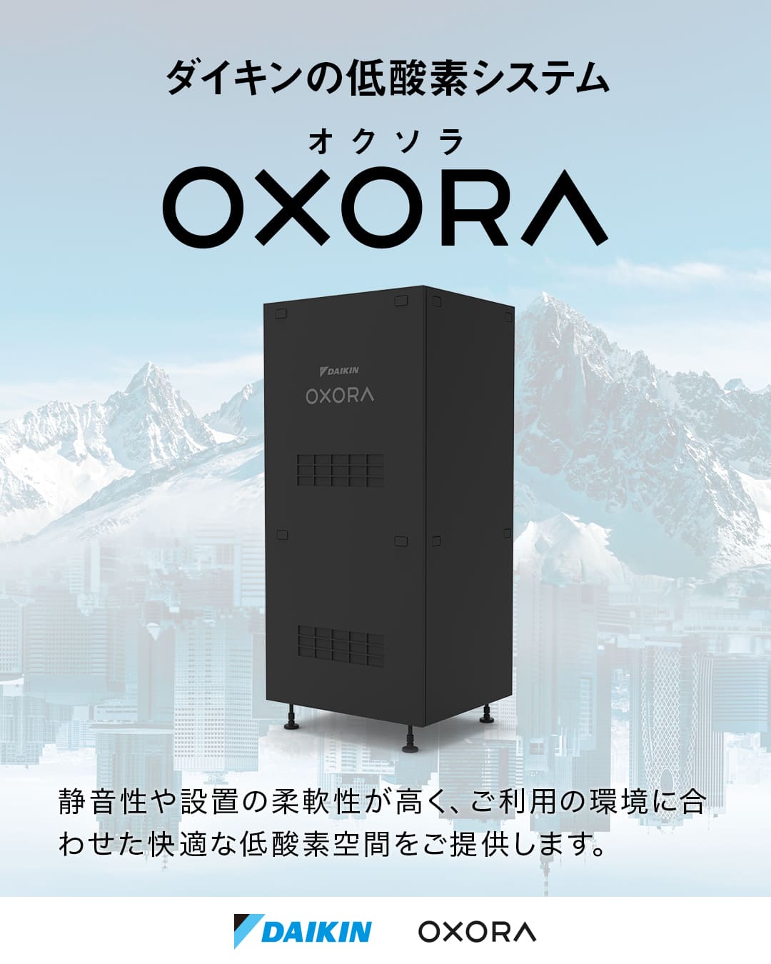2026年4月に東京ビッグサイトにて開催される「スポーツチーム・アスリート向け総合展Japan Sports Week 」に低酸素システムOXORAを出展します。OXORAは、気圧はそのままで酸素濃度を細やかにコントロールすることで、標高1,200~3,900mに相当する酸素濃度(18.2~13%)の環境を作り出します。これにより、普段のトレーニングルームを短時間で高い運動効果が得られる低酸素空間に変えることができ、アスリートのパフォーマンス向上やジムでの新コンテンツとしての差別化に活用できます。高い品質と耐久性で安定した低酸素空間を提供する「信頼性」、静けさを求められる場所にも設置可能な「静音性」、ユニット構造により装置の搬入・設置が容易にできる「柔軟性」に優れています。ぜひ会場にて低酸素空間をご体感ください。